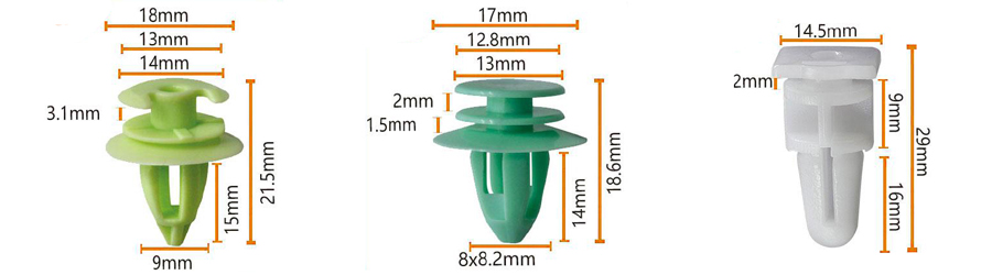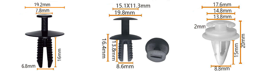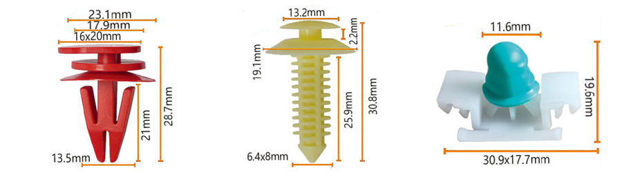 คลิปการปลดปล่อยอย่างรวดเร็วพลาสติก: ใช้สำหรับการติดตั้งแผงตัวถังกันชนกันชนแผ่นรองพื้นล้อและอื่น ๆ คลิปเหล่านี้มักจะทำจากพลาสติกที่ทนทานอุณหภูมิสูงและมีความแข็งแรงสูงและได้รับการออกแบบด้วยฟังก์ชั่นการเปิดตัวอย่างรวดเร็วทำให้ง่ายต่อการซ่อมแซมหรือเปลี่ยนชิ้นส่วน