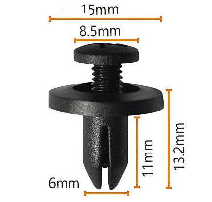 เส้นผ่านศูนย์กลางศีรษะของตัวยึดนี้คือ 15 มม. ความสูงโดยรวมคือ 13.2 มม. ความกว้างของด้านล่างคือ 8.5 มม. ความยาวของสกรูคือ 11 มม. มันเหมาะสำหรับการติดตั้งแผงตกแต่งภายในชิ้นส่วนของเครื่องยนต์